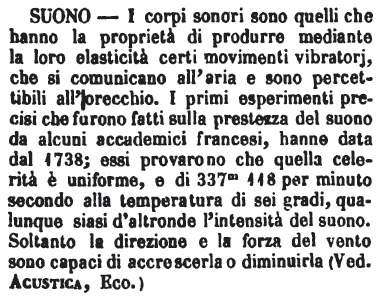 | Suono - I corpi sonori sono quelli che hanno la proprietà di produrre mediante la loro elasticità certi movimenti vibratorj, che si comunicano all'aria e sono percettibili all'orecchio. I primi esperimenti precisi che furono fatti sulla prestezza del suono da alcuni accademici francesi, hanno data dal 1738; essi provarono che quella celerità è uniforme, e di 337m 118 per minuto secondo alla temperatura di sei gradi, qualunque siasi d'altronde l'intensità del suono. Soltando la direzione e la forza del vento sono capaci di accrescerla o diminuirla (Ved. Acustica, Eco.) [immagine] |