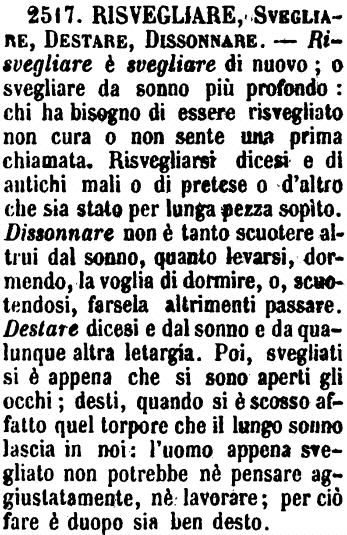 | Risvegliare, Svegliare, Destare, Dissonnare - Risvegliare è svegliare di nuovo; o svegliare da sonno più profondo: chi ha bisogno di essere risvegliato non cura o non sente una prima chiamata. Risvegliarsi dicesi e di antichi mali o di pretese o d'altro che sia stato per lunga pezza sopito. Dissonnare non è tanto scuotere altrui dal sonno, quanto levarsi, dormendo, la voglia di dormire, o, scuotendosi, farsela altrimenti passare. Destare dicesi e dal sonno e da qualunque altra letargía. Poi, svegliati si è appena che si sono aperti gli occhi; desti, quando si è scosso affatto quel torpore che il lungo sonno lascia in noi: l'uomo appena svegliato non potrebbe nè pensare aggiustatamente, nè lavorare; per ciò fare è duopo sia ben desto. [immagine] |
