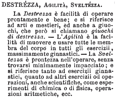 | Destrezza, Agilità, Sveltezza - La Destrezza è facilità di operare prontamente e bene; e si riferisce ad arti e mestieri, ed anche a giuochi, che però si chiamano giuochi di destrezza. - L'Agilità è la facilità di muovere e usare tutte le membra del corpo in tutti gli esercizii, massimamente ginnastici. - La Sveltezza è prontezza nell'operare, senza trovarsi minimamente impacciato; e si riferisce tanto ad esercizii ginnastici, quanto ad altri esercizii od operazioni, anche scientifiche, come esperimenti di chimica o di fisica, operazioni aritmetiche, ecc. [immagine] |