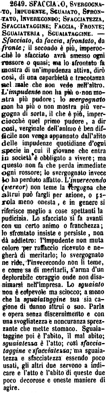 | Sfacciato, Svergognato, Impudente, Sguaiato, Sfrontato, Inverecondo; Sfacciatezza, Sfacciataggine, Faccia, Fronte; Sguaiateria, Sguaiataggine - Sfacciato, da faccia, sfrontato, da fronte; il secondo è più, imperocchè lo sfacciato avrà smesso ogni rossore o quasi; ma lo sfrontato fa mostra di un'impudenza attiva, dirò così, di una caparbietà e tracotanza nel male che non vede nell'altro. L'impudente non ha più o non mostra più pudore; lo svergognato non ha più o non mostra più vergogna di sorta, il che è più, imperciocchè quel primo pudore, a dir così, verginale dell'animo è ben difficile non venga appannato dall'alito delle impudenze quotidiane d'ogni specie in cui il giovane che entra in società è obbligato a vivere; ma questo non fa che perda immediate ogni rossore; lo svergognato invece lo ha perduto affatto. L'inverecondo (vereor) non teme la vergogna che altrui può fargli per azione, o parola meno onesta, e in genere si riferisce meglio a cose spettanti la pudicizia. Lo sfacciato si fa avanti con un certo animo o franchezza; lo sfrontato insiste e persiste, non dà addietro: l'impudente non muta colore per raffaccio ricevuto e negherà di meritarlo; lo svergognato ne ride, l'inverecondo non li teme, e come sa di meritarli, s'arma d'un deplorabile coraggio onde non disanimarsi nell'impresa. Lo sguaiato non è colpevole ma sciocco; a meno che la sguaiataggine sua sia cagione di danno altrui o suo. Parla e opera senza discernimento e con una svogliatezza e noncuranza sprezzante che mette stomaco. Sguaiataggine poi è l'abito, il mal abito; sguaiatezza è l'atto; così sfacciataggine e sfacciatezza; ma sguaiatezza e sfacciatezza essendo poco usati, gli altri due servono a indicare e l'atto e l'abito di queste due poco decorose e oneste maniere di agire. [immagine] |