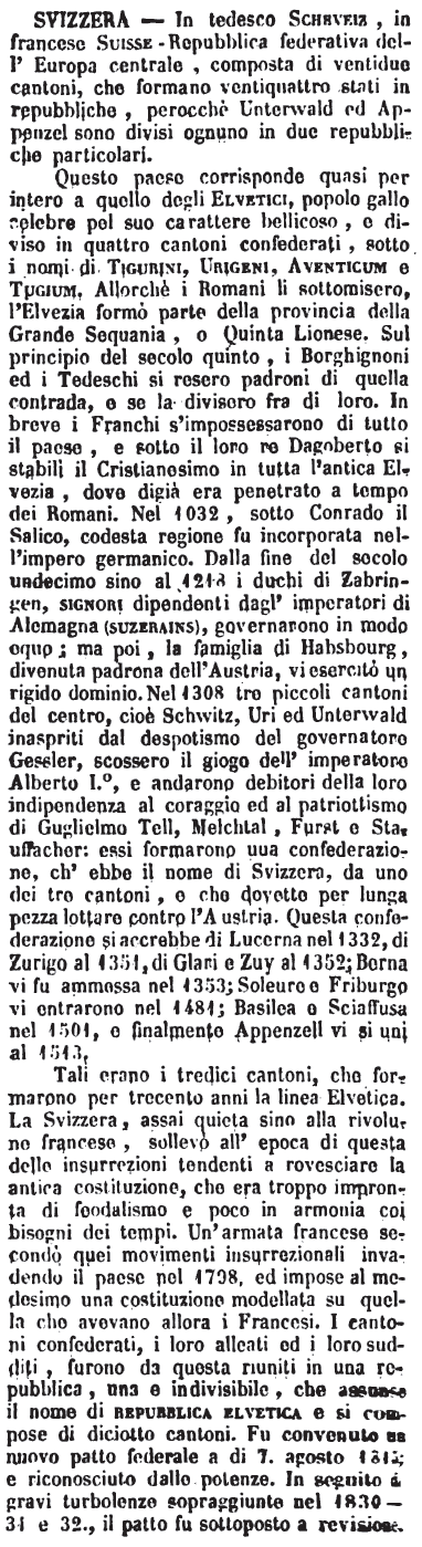 | Svizzera - In tedesco Scheveiz, in francese Suisse - Repubblica federativa dell'Europa centrale, composta di ventidue cantoni, che formano ventiquattro stati in repubbliche, perocchè Unterwald ed Appenzel sono divisi ognuno in due repubbliche particolari.