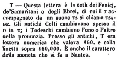 | T - Questa lettera è la teth dei Fenicj, de' Samaritani e degli Ebrei, di cui il t accompagnato da un suono ts si chiama tsade. Gli antichi Celti cambiavano spesso il d in t; i Tedeschi cambiano l'uno o l'altro nella pronunzia. Presso gli antichi, T era lettera numerica che valeva 160, e colla linetta sopra 160,000. E' anche il carattere della moneta che si fa a Nantes. [immagine] |