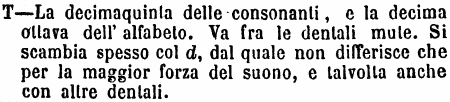 | T - La decimaquinta delle consonanti, e la decima ottava dell'alfabeto. Va fra le dentali mute. Si scambia spesso col d, dal quale non differisce che per la maggior forza del suono, e talvolta anche con altre dentali. [immagine] |