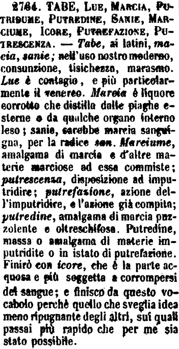 | Tabe, Lue, Marcia, Putridume, Putredine, Sanie, Marciume, Icore, Putrefazione, Putrescenza - Tabe, ai latini, macia, sanie; nell'uso nostro moderno, consunzione, tisichezza, marasmo. Lue è contagio, e più particolarmente il venereo. Marcia è liquore corrotto che distilla dalle piaghe esterne o da qualche organo interno leso; sanie, sarebbe marcia sanguígna per la radice san. Marciume, amalgama di marcía e d'altre materie marciose ad essa commiste; putrescenza, disposizione ad imputridire; putrefazione, azione dell'imputridire, e l'azione già compita; putredine, amalgama di marcia puzzolente e oltreschifosa. Putredíne, massa o amalgama di materie imputridite o in istato di putrefazione. Finirò con icore, che è la parte acquosa e più soggetta a corrompersi del sangue; e finisco da questo vocabolo perchè quello che sveglia idea meno ripugnante degli altri, sui quali passai più rapido che per me sia stato possibile. [immagine] |