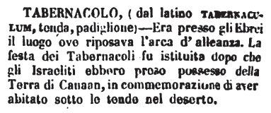| Tabernacolo - (dal latino tabernaculum, tenda, padiglione) - Era presso gli Ebrei il luogo ove riposava l'arca d'alleanza. La festa dei Tabernacoli fu istituita dopo che gli Israeliti ebbero preso possesso della Terra di Canaan, in commemorazione di aver abitato sotto le tende nel deserto. [immagine] |