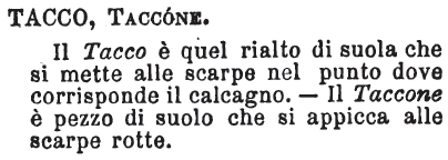 | Tacco, Taccone - Il Tacco è quel rialzo di suola che si mette alle scarpe nel punto dove corrisponde il calcagno. - Il Taccone è pezzo di suolo che si appicca alle scarpe rotte. [immagine] |