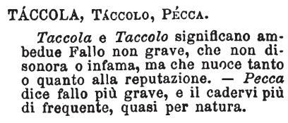 | Taccola, Taccolo, Pecca - Taccola e Taccolo significano ambedue Fallo non grave, che non disonora o infama, ma che nuoce tanto o quanto alla reputazione. - Pecca dice fallo più grave, e il cadervi più di frequente, quasi per natura. [immagine] |