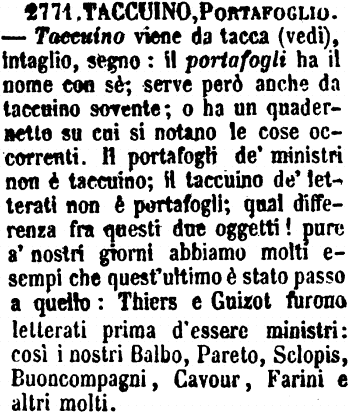 | Taccuino, Portafoglio - Taccuino viene da tacca (vedi), intaglio, segno: il portafogli ha il nome con sè; serve però anche da taccuino sovente; o ha un quadernetto su cui si notano le cose occorrenti. Il portafogli de' ministri non è taccuino; il taccuino de' letterati non è portafogli; qual differenza fra questi due oggetti! pure a' nostri giorni abbiamo molti esempi che quest'ultimo è stato passo a quello: Thiers e Guizot furono letterati prima d'essere ministri: così i nostri Balbo, Pareto, Sclopis, Buoncompagni, Cavour, Farini e altri molti. [immagine] |