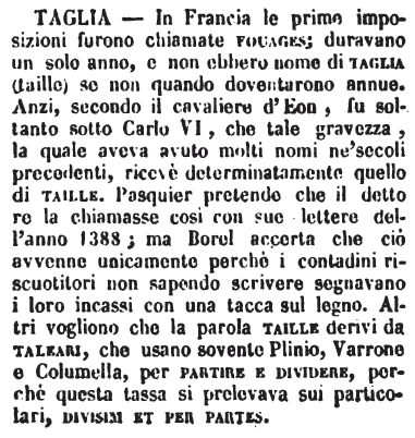 | Taglia - In Francia le prime imposizioni furono chiamare fouages; duravano un solo anno, e non ebbero nome di taglia (taille) se non quando doventarono annue. Anzi, secondo il Cavaliere d'Eon, fu soltanto sotto Carlo VI, che tale gravezza, la quale aveva avuto molti nomi ne' secoli precedenti, ricevè determinatamente quello di taille. Pasquier pretende che il detto re la chiamasse così con sue lettere dell'anno 1388; ma Borel accerta che ciò avvenne unicamente perchè i contadini riscuotitori non sapendo scrivere segnavano i loro incassi con una tacca sul legno. Altri vogliono che la parola taille derivi da taleari, che usano sovente Plinio, Varrone e Columella, per partire e dividere, perchè questa tassa si prelevava sui particolari, divisim et per partes. [immagine] |