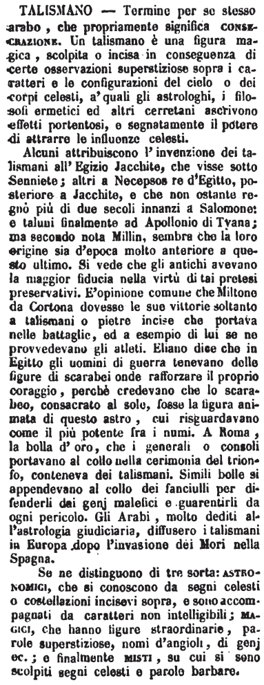 | Talismano - Termine per se stesso arabo, che propriamente significa consecrazione. Un talismano è una figura magica, scolpita o incisa in conseguenza di certe osservazioni superstiziose sopra i caratteri e le configurazioni del cielo o dei corpi celesti, a’ quali gli astrologhi, i filosofi ermetici ed altri cerretani ascrivono effetti portentosi, e segnatamente il potere di attrarre le influenze celesti.