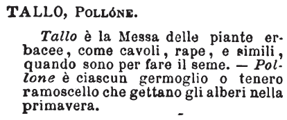 | Tallo, Pollone - Tallo è la Messa delle piante erbacee, come cavoli, rape, e simili, quando sono per fare il seme. - Pollone è ciascun germoglio o tenero ramoscello che gettano gli alberi nella primavera. [immagine] |