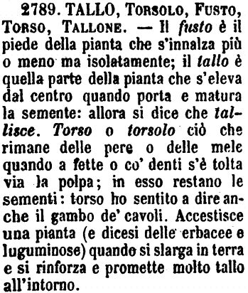 | Tallo, Torsolo, Fusto, Torso, Tallone - Il fusto è il piede della pianta che s'innalza più o meno ma isolatamente; il tallo è quella parte della pianta che s'eleva dal centro quando porta e matura la semente: allora si dice che tallisce. Torso o torsolo ciò che rimane delle pere o delle mele quando a fette o co' denti s'è tolta via la polpa; in esso restano le sementi: torso ho sentito a dire anche il gambo de' cavoli. Accestisce una pianta (e dicesi delle erbacee e luguminose) quando si slarga in terra e si rinforza e promette molto tallo all'intorno. [immagine] |