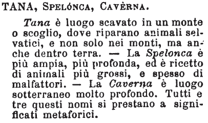 | Grotta, Spelonca, Tana, Antro - La Grotta è il luogo vuoto, dentro a un monte, che può essere ricetto di animali e anche d'uomini. Può altresì essere artificiale, e servire di umano recesso. - Spelonca è più orrida, più grande, buja, profonda. - Tana è stretta e orrida; ed è ricetto di fiere, come lupi, volpi e simili. - Antro è grotta anche più nobile; ma è voce della poesia e dello stile nobile. [immagine] |
