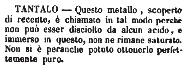 | Tantalo - Questo metallo, scoperto di recente, è chiamato in tal modo perchè non può esser disciolto da alcun acido, e immerso in questo, non ne rimane saturato. Non si è peranche potuto ottenerlo perfettamente puro. [immagine] |