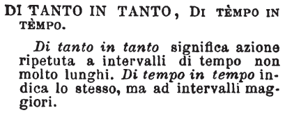 | Di tanto in tanto, Di tempo in tempo - Di tanto in tanto significa azione ripetuta a intervalli di tempo non molto lunghi. Di tempo in tempo indica lo stesso, ma ad intervalli maggiori. [immagine] |