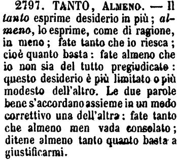 | Tanto, Almeno - Il tanto esprime desiderio in più; almeno, lo esprime, come di ragione, in meno; fate tanto che io riesca; cioè quanto basta: fate almeno che io non sia del tutto pregiudicato: questo desiderio è più limitato o più modesto dell'altro. Le due parole bene s'accordano assieme in un modo correttivo una dell'altra; fate tanto che almeno men vada consolato; ditene almeno tanto quanto basta a giustificarmi. [immagine] |