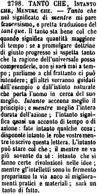 | Tanto che, Intanto che, Mentre che - Tanto che nel significato di mentre mi pare francesismo, e pretta traduzione del tant que. Il tanto sta bene col che quando significa quantità maggiore di tempo: se a promulgare dottrine di giusto progresso si aspetta tanto che la ragione dell'universale possa comprenderle, non si sarà mai a tempo; parliamo a chi frattanto ci può intendere; gli altri verranno guidati dall'esempio o dall'istinto naturale che porta l'uomo in cerca del suo meglio. Intanto accenna meglio il principio; e mentre meglio l'intera durata dell'azione; l'intanto significa quasi un acconto di tempo o di azione: fate intanto qualche cosa; disponete intanto le robe vostre mentre io scrivo questa lettera. L'intanto può stare col che; il mentre ne va più sovente da sè: intanto che si fanno certe rivoluzioni nelle idee; mentre gl'intelletti sono in fermento prepariamo la via anco ai miglioramenti pratici e materiali; sarà un tanto di fatto. [immagine] |