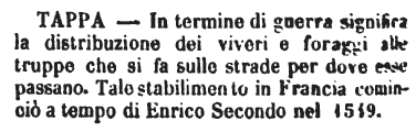 | Tappa - In termine di guerra significa la distribuzione dei viveri e foraggi alle truppe che si fa sulle strade per dove esse passano. Tale stabilimento in Francia cominciò a tempo di Enrico Secondo nel 1519. [immagine] |