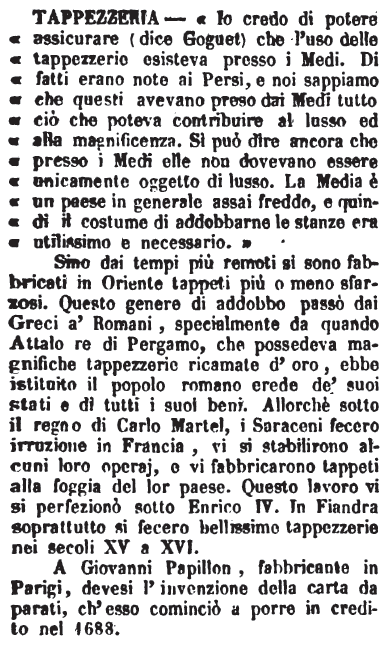 Sino dai tempi più remoti si sono fabbricati in Oriente tappeti più o meno sfarzosi. Questo genere di addobbo passò dai Greci a' Romani, specialmente da quando Attalo re di Pergamo, che possedeva magnifiche tappezzerie ricamate d'oro, ebbe istituito il popolo romano erede de' suoi stati e di tutti i suoi beni. Allorchè sotto il regno di Carlo Martel, i Saraceni fecero irruzione in Francia, vi si stabilirono alcuni loro operaj, e vi fabbricarono tappeti alla foggia del lor paese. Questo lavoro vi si perfezionò sotto Enrico IV. In Fiandra soprattutto si fecero bellissime tappezzerie nei secoli XV a XVI. A Giovanni Papillon, fabbricante in Parigi, devesi l'invenzione della carta da parati, ch'esso cominciò a porre in credito nel 1688. [immagine] |