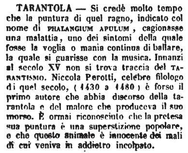 | Tarantola - Si credè molto tempo che la puntura di quel ragno, indicato col nome di phalangium apulum, cagionasse una malattia, uno dei sintomi della quale fosse la voglia o mania continua di ballare, la quale si guarisse con la musica. Innanzi al secolo XV non si trova traccia del tarantismo. Niccola Perotti, celebre filologo di quel secolo, (1430 a 1480) è forse il primo autore che abbia discorso della tarantola e del malore che produceva il suo morso. E' ormai riconosciuto che la pretesa sua puntura è una superstizione popolare, e che questo animale è innocente dei mali di cui veniva in addietro incolpato. [immagine] |
