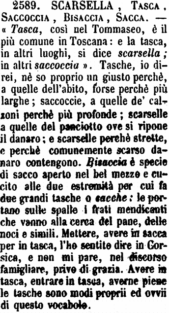 | Scarsella, Tasca, Saccoccia, Bisaccia, Sacca - «Tasca, così nel Tommaseo, è il più comune in Toscana: e la tasca, in altri luoghi, si dice scarsella; in altri saccoccia». Tasche, io direi, nè so proprio un giusto perchè, a quelle dell'abito, forse perchè più larghe; saccoccie, a quelle de' calzoni perchè più profonde; scarselle a quelle del panciotto ove si ripone il danaro; e scarselle perchè strette, e perchè comunemente scarso danaro contengono. Bisaccia è specie di sacco aperto nel bel mezzo e cucito alle due estremità per cui fa due grandi tasche o sacche: le portano sulle spalle i frati mendicanti che vanno alla cerca del pane, delle noci e simili. Mettere, avere in sacca per in tasca, l'ho sentito dire in Corsica, e non mi pare, nel discorso famigliare, privo di grazia. Avere in tasca, entrare in tasca, averne piene le tasche sono modi proprii ed ovvii di questo vocabolo. [immagine] |