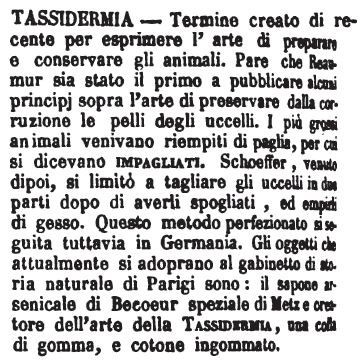 | Tassidermia - Termine creato di recente per esprimere l'arte di preparare e conservare gli animali. Pare che Reaumur sia stato il primo a pubblicare alcuni principj sopra l'arte di preservare dalla corruzione le pelli degli uccelli. I più grossi animali venivano riempiti di paglia, per cui si dicevano impagliati. Schoeffer, venuto dipoi, si limitò a tagliare gli uccelli in due parti dopo averli spogliati, ed empirli di gesso. Questo metodo perfezionato si seguita tuttavia in Germania. Gli oggetti che attualmente si adoprano al gabinetto di storia naturale di Parigi sono: il sapone arsenicale di Becoeur speziale di Metz e creatore dell'arte della Tassidermia, una colla di gomma, e cotone gommato. [immagine] |