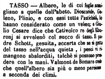 | Tasso - Albero, le di cui foglie somigliano a quelle dell'abeto. Dioscoride, Galeno, Plinio, e con essi tutta l'antichità, lo hanno considerato come un veleno; e Giulio Cesare dice che Cativolco re degli Eburonj si avvelenò col succo di tasso. Il padre Schott, gesuita, accerta che se si getta del tasso nell'acqua quieta, i pesci vi rimangono sbalorditi, talchè si possono prendere con le mani. Valmont de Bomare crede che quell'albero sia più o meno pernicioso a seconda dei climi. [immagine] |