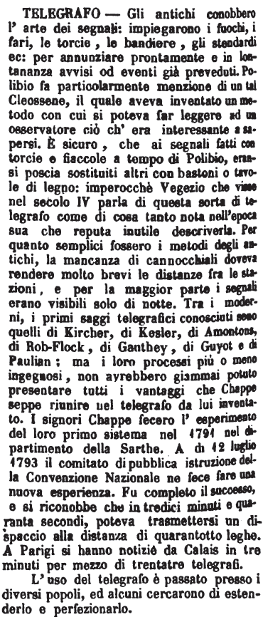 | Telegrafo - Gli antichi conobbero l'arte dei segnali: impiegarono i fuochi, i fari, le torcie, le bandiere, gli stendardi ec: per annunziare prontamente e in lontananza avvisi od eventi già preveduti. Polibio fa particolarmente menzione di un tal Cleossene, il quale aveva inventato un metodo con cui si poteva far leggere ad un osservatore ciò ch'era interessante a sapersi. E' sicuro, che ai segnali fatti con torcie e fiaccole a tempo di Polibio, eransi poscia sostituiti altri con bastoni o tavole di legno: imperocchè Vegezio che visse nel secolo IV parla di questa sorta di telegrafo come di cosa tanto nota nell'epoca sua che reputa inutile descriverla. Per quanto semplici fossero i metodi degli antichi, la mancanza di cannocchiali doveva rendere molto brevi le distanze fra le stazioni, e per la maggior parte i segnali erano visibili solo di notte. Tra i moderni, i primi saggi telegrafici conosciuti sono quelli di Kircher, di Kesler, di Amontons, di Rob-Flock, di Ganthey, di Guyot e di Paulian; ma i loro processi più o meno ingegnosi, non avrebbero giammai potuto presentare tutti i vantaggi che Chappe seppe riunire nel telegrafo da lui inventato. I signori Chappe fecero l'esperimento del loro primo sistema nel 1791 nel dipartimento della Sarthe. A di 12 luglio 1793 il comitato di pubblica istruzione della Convenzione Nazionale ne fece fare una nuova esperienza. Fu completo il successo, e si riconobbe che in tredici minuti e quaranta secondi, poteva trasmettersi un dispaccio alla distanza di quarantotto leghe. A Parigi si hanno notizie da Calais in tre minuti per mezzo di trentatre telegrafi.