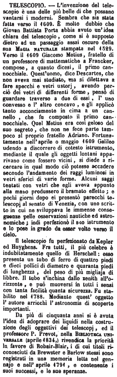 Da più di cinquanta anni si è avuta l'idea di adoprare dei liquidi nella costruzione degli oggettivi dei telescopj, ed il professore P. Prevot, nella Biblioteca universale (aprile 1834,) rivendica la priorità In favore di Robair-Blair, i di cui titoli riconosciuti da Brewster e Barlow stessi sono registrati in una memoria letta nel gennajo e nell'aprile 1791, e contenente i suoi successi, e le sue speranze. [immagine] |