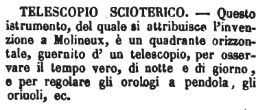 | Telescopio scioterico - Questo istrumento, del quale si attribuisce l'invenzione a Molineux, è un quadrante orizzontale, guernito d'un telescopio, per osservare il tempo vero, di notte e di giorno, e per regolare gli orologi a pendola, gli oriuoli, ec. [immagine] |