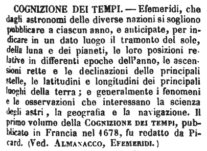 | Cognizione dei tempi - - Efemeridi, che dagli astronomi delle diverse nazioni si sogliono pubblicare a ciascun anno, e anticipate, per indicare in un dato luogo il tramonto del sole, della luna e dei pianeti, le loro posizioni relative in differenti epoche dell'anno, le ascensioni rette e le declinazioni delle principali stelle, la latitudini e longitudini dei principali luoghi della terra; e generalmente i fenomeni e le osservazioni che interessano la scienza degli astri, la geografia e la navigazione. Il primo volume della Cognizione dei tempi, pubblicato in Francia nel 1678, fu redatto da Picard. (Ved. Almanacco, Efemeridi.) [immagine] |