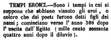| Tempi eroici - Sono i tempi in cui si suppone che abbiano vissuto gli eroi, o coloro che dai poeti furono detti figli dei numi; cominciano verso l'anno 308 dopo l'uscita dall'Egitto (mille cento sessanta quattro anni dopo il diluvio). [immagine] |