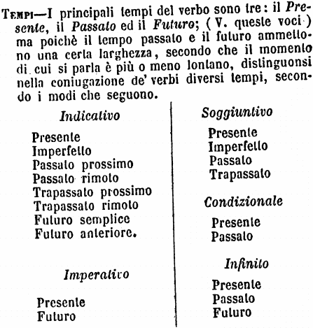 | Tempi - I principali tempi del verbo sono tre: il Presente, il Passato ed il Futuro; (v. queste voci) ma poichè il tempo passato e il futuro ammettono una certa larghezza, secondo che il momento di cui si parla è più o meno lontano, distinguonsi nella coniugazione de' verbi diversi tempi, secondo i modi che seguono.