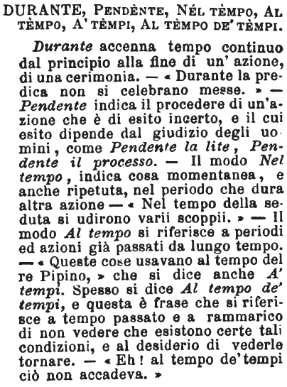 | Durante, Pendente, Nel tempo, Al tempo, A’tempi, Al tempo de' tempi - Durante accenna tempo continuo dal principio alla fine di un'azione, di una cerimonia. - «Durante la predica non si celebrano messe.» - Pendente indica il procedere di un'azione che è di esito incerto, e il cui esito dipende dal giudizio degli uomoni, come Pendente la lite, Pendente il processo. - Il modo Nel tempo, indica cosa momentanea, e anche ripetuta, nel periodo che dura altra azione - «Nel tempo della seduta si udirono varii scoppii.» - Il modo Al tempo si riferisce a periodi ed azioni già passati da lungo tempo. - «Queste cose usavano al tempo del re Pipino,» che si dice anche A' tempi. Spesso si dice Al tempo de' tempi, e questa è frase che si riferisce a tempo passato e a rammarico di non vedere che esistono certe tali condizioni, e al desiderio di vederle tornare. - «Eh! al tempo de' tempi ciò non accadeva.» [immagine] |
