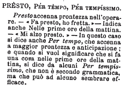 | Presto, Per tempo, Per tempissimo - Presto accenna prontezza nell'operare. - « Fa presto, ho fretta. » - Indica anche Nelle prime ore della mattina. - « Mi alzo presto. » - In questo caso si dice anche Per tempo, che accenna a maggior prontezza e anticipazione; e quando si vuol significare che si fa una cosa nelle prime ore della mattina, si dice da alcuni Per tempissimo, che non è secondo grammatica, ma che può ad alcuno sembrare efficace. [immagine] |
