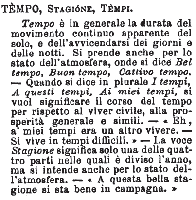 | Tempo, Stagione, Tempi - Tempo è in generale la durata del movimento continuo apparente del sole, e dell'avvicendarsi dei giorni e delle notti. Si prende anche per lo stato dell'atmosfera, onde si dice Bel tempo, Buon tempo, Cattivo tempo. - Quando si dice in plurale I tempi, A questi tempi, Ai miei tempi, si vuol significare il corso del tempo per rispetto al viver civile, alla prosperità generale e simili. - «Eh, a' miei tempi era un altro vivere. - Si vive in tempi difficili.» - La voce Stagione significa solo una delle quattro parti nelle quali è diviso l'anno, ma si intende anche per lo stato dell'atmosfera. - «A questa bella stagione si sta bene in campagna.» [immagine] |
