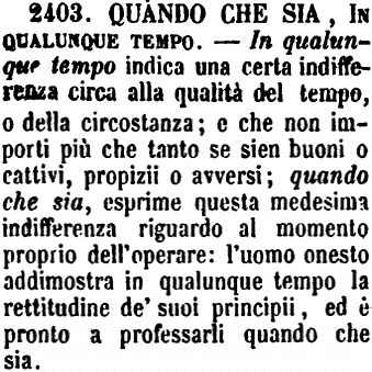| Quando che sia, In qualunque tempo - In qualunque tempo indica una certa indifferenza circa alla qualità del tempo, o della circostanza; e che non importi più che tanto se sien buoni o cattivi, propizii o avversi; quando che sia, esprime questa medesima indifferenza riguardo al momento proprio dell'operare: l'uomo onesto addimostra in qualunque tempo la rettitudine de' suoi principii, ed è pronto a professarli quando che sia. [immagine] |