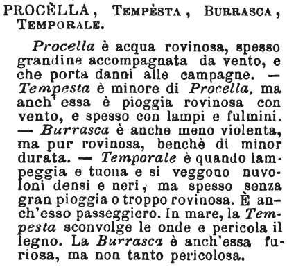 | Procella, Tempesta, Burrasca, Temporale - Procella è acqua rovinosa, spesso grandine accompagnata da vento, e che porta danni alle campagne. - Tempesta è minore di Procella, ma anch'essa è pioggia rovinosa con vento, e spesso con lampi e fulmini. - Burrasca è anche meno violenta, ma pur rovinosa, benchè di minor durata. - Temporale è quando lampeggia e tuona e si veggono nuvoloni densi e neri, ma spesso senza gran pioggia o troppo rovinosa. È anch'esso passeggiero. In mare, la Tempesta sconvolge le onde e pericola il legno. La Burrasca è anch'essa furiosa, ma non tanto pericolosa. [immagine] |