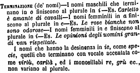 | Terminazione (de’ nomi) - I nomi maschili che terminano in o finiscono al plurale in i - Es. Carletto è amante di cavalli - I nomi femminili in a finiscono al plurale in e - Es. Le rose bianche non sono odorose - I nomi femminili in e finiscono al plurale in i - Es. Le opinioni degli uomini grandi van rispettate.