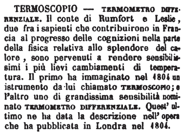 | Termoscopio - termometro differenziale. Il conte di Rumfort e Leslie, due fra i sapienti che contribuirono in Francia al progresso delle cognizioni nella parte della fisica relativa allo splendore del calore, sono pervenuti a rendere sensibilissimi i più lievi cambiamenti di temperatura. Il primo ha immaginato nel 1804 un istrumento da lui chiamato termoscopio; e l'altro uno di grandissima sensibilità nominato termometro differenziale. Quest'ultimo ne ha data la descrizione nell'opera che ha pubblicata in Londra nel 1804. [immagine] |