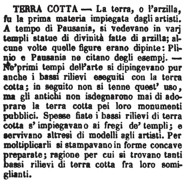 | Terra cotta - La terra, o l'arzilla, fu la prima materia impiegata dagli artisti. A tempo di Pausania, si vedevano in varj templi statue di divinità fatte di arzilla; alcune volte quelle figure erano dipinte: Plinio e Pausania ne citano degli esempj. - Ne' primi tempi dell'arte si dipingevano pur anche i bassi rilievi eseguiti con la terra cotta; in seguito non si tenne quest'uso, ma gli antichi non isdegnarono mai di adoprare la terra cotta pei loro monumenti pubblici. Spesse fiate i bassi rilievi di terra cotta s'impiegavano ai fregi de' templi; e servivano altresì di modelli agli artisti. Per moltiplicarli si stampavano in forme concave preparate; ragione per cui si trovano tanti bassi rilievi di terra cotta fra loro somiglianti. [immagine] |