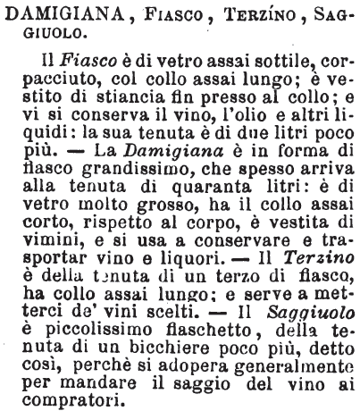 | Damigiana, Fiasco, Terzino, Saggiuolo - Il Fiasco è di vetro assai sottile, corpacciuto, col collo assai lungo; è vestito di stiancia fin presso al collo; e vi si conserva il vino, l’olio e altri liquidi: la sua tenuta è di due litri poco più. – La Damigiana è in forma di fiasco grandissimo, che spesso arriva alla tenuta di quaranta litri: è di vetro molto grosso, ha il collo assai corto, rispetto al corpo, è vestita di vimini, e si usa a conservare e trasportar vino e liquori. – Il Terzino è della tenuta di un terzo di fiasco, ha collo assai lungo; e serve a metterci de' vini scelti. – Il Saggiuolo è piccolissimo fiaschetto, della tenuta di un bicchiere poco più, detto così, perché si adopera generalmente per mandare il saggio del vino ai compratori. [immagine] |