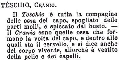 | Teschio, Cranio - Il Teschio è tutta la compagine delle ossa del capo, spogliato delle parti molli, e spiccato dal busto.- Il Cranio sono quelle ossa che formano la volta del capo, e dentro alle quali sta il cervello, e si dice anche del corpo vivente, allorché è vestito della pelle e dei capelli. [immagine] |