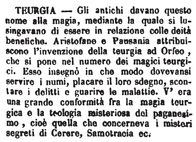 | Teurgia - Gli antichi davano questo nome alla magia, mediante la quale si lusingavano di essere in relazione colle deità benefiche. Aristofane e Pausania attribuiscono l'invenzione della teurgia ad Orfeo, che si pone nel numero dei magici teurgici. Esso insegnò in che modo dovevansi servire i numi, placare il loro sdegno, scontare i delitti e guarire le malattie. V'era una grande conformità fra la magia teurgica e la teologia misteriosa del paganesimo, cioè quella che concerneva i misteri segreti di Cerere, Samotracia ec. [immagine] |