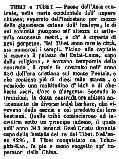 | Tibet o Tubet - Paese dell'Asia centrale, nella parte occidentale dell'impero chinese; separato dall'Indostano per mezzo della gigantesca catena dell'Imalaya, le di cui sommità giungono all'altezza di settemila ottocento metri, e ch'è coperta di nevi perpetue. Nel Tibet sono rare le città, ma numerosi i templi. Vicino alla capitale si osserva il palazzo del Dalai-Lama, capo della religione, e sovrano temporale della contrada, il quale fu costruito nell'anno 630 dell'era cristiana sul monte Poutala, e che contiene più di dieci mila stanze, e possiede una moltitudine d'idoli e di obelischi sacri d'oro e d'argento. Secondo le tradizioni, la detta contrada era abitata anticamente da diverse tribù barbare, che vivevano della caccia e col prodotto dei loro bestiami. Quelle tribù cominciarono ad incivilirsi sotto un principe indiano, il quale nell'anno 313 innanzi Gesù Cristo doventò capo della famiglia dei re del Tibet. Nell'anno 1296, il Tibet conquistato da Tchinghiz-Kan, fu più e meno soggetto agl'imperatori della China. [immagine] |