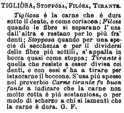 | Tigliosa, Stopposa, Filosa, Tirante - Tigliosa è la carne che è dura sotto il dente, e come coriacea; Filosa quando le fibre si separano l'una dall'altra e restano per lo più fra' denti; Stopposa quando per una specie di secchezza e per il dividersi delle fibre più sottili, s'appalla in bocca quasi come stoppa; Tirante è quella che resiste a esser divisa coi denti, e con essi s'ha a tirare per istaccarne il boccone. S'usa più spesso nel proverbio Carne tirante fa buon fante a indicare che la carne non molto cotta è più sostanziosa, o per modo di scherzo a chi si lamenti che la carne è dura. G. F. [immagine] |