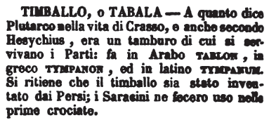 | Timballo, o Tabala - A quanto dice Plutarco nella vita di Crasso, e anche secondo Hesychius, era un tamburo di cui si servivano i Parti: fa in arabo tablon, in greco tympanon, ed in latino tympanum. Si ritiene che il timballo sia stato inventato dai Persi; i Saracini ne fecero uso nelle prime crociate. [immagine] |