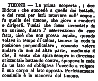 | Timone - La prima scoperta, (dice Eidous) che succedè a quella dei battelli, e dei remi per farli nuovere sull'acqua, fu quella del timone, che giova a condurli e dirigerli. Vuolsi che fosse inventato da un curioso, dietro l'osservazione da esso fatta, cioè che una grossa aquila, quando volava in tempo di calma, teneva la coda in posizione perpendicolare, secondo voleva andare da una ad altra parte, mediante il che, il vento che spira sempre in direzione orizzontale battendo contro, spingeva la coda da un lato ed obbligava l'uccello a volgere il suo corpo al lato opposto. Perfettamente consimile è la manovra del timone. [immagine] |