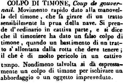 | Colpo di timone - Coup de gouvernail. Movimento rapido dato alla manovella del timone, che fa girare di un tratto sensibilmente la prua della nave. Si prende d'ordinario in cattiva parte, e si dice che il timoniere ha dato un falso colpo di timone, quando un bastimento di un tratto s'allontana dalla rotta che deve tenere; il che è di molto pericolo in un cattivo tempo. Nondimeno talvolta si dà espressamente un colpo di timone per ischivare un abbordaggio o un oggetto impreveduto. [immagine] |