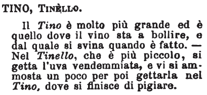 | Tino, Tinello - Il Tino è molto più grande ed è quello dove il vino sta a bollire, e dal quale si svina quando è fatto. - Nel Tinello, che è più piccolo, si getta l'uva vendemmiata, e vi si ammosta un poco per poi gettarla nel Tino, dove si finisce di pigiare. [immagine] |